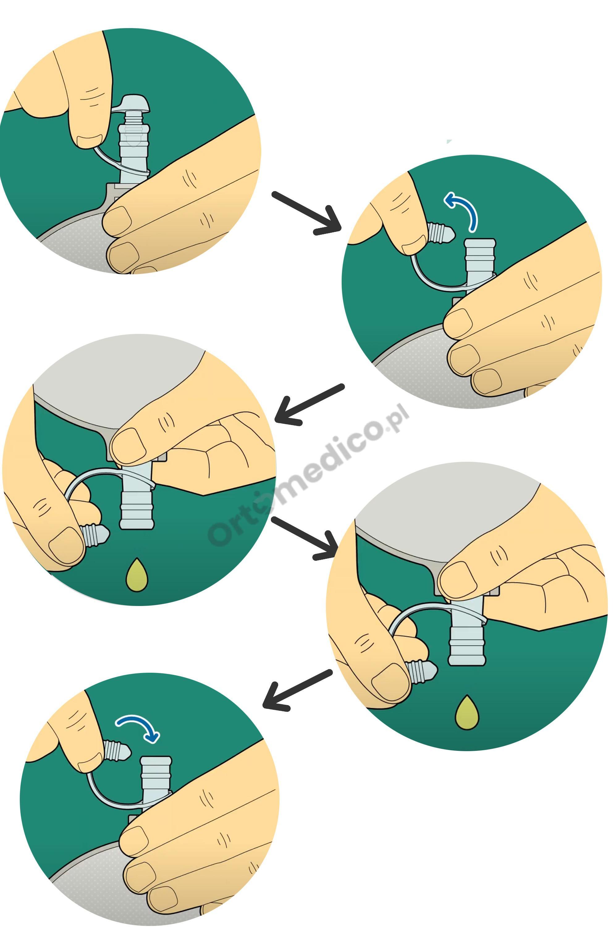 - Zdezynfekuj końcówkę odprowadzającą worka gazikiem nasączonym środkiem antyseptycznym, możesz użyć także sprayu i chusteczki
