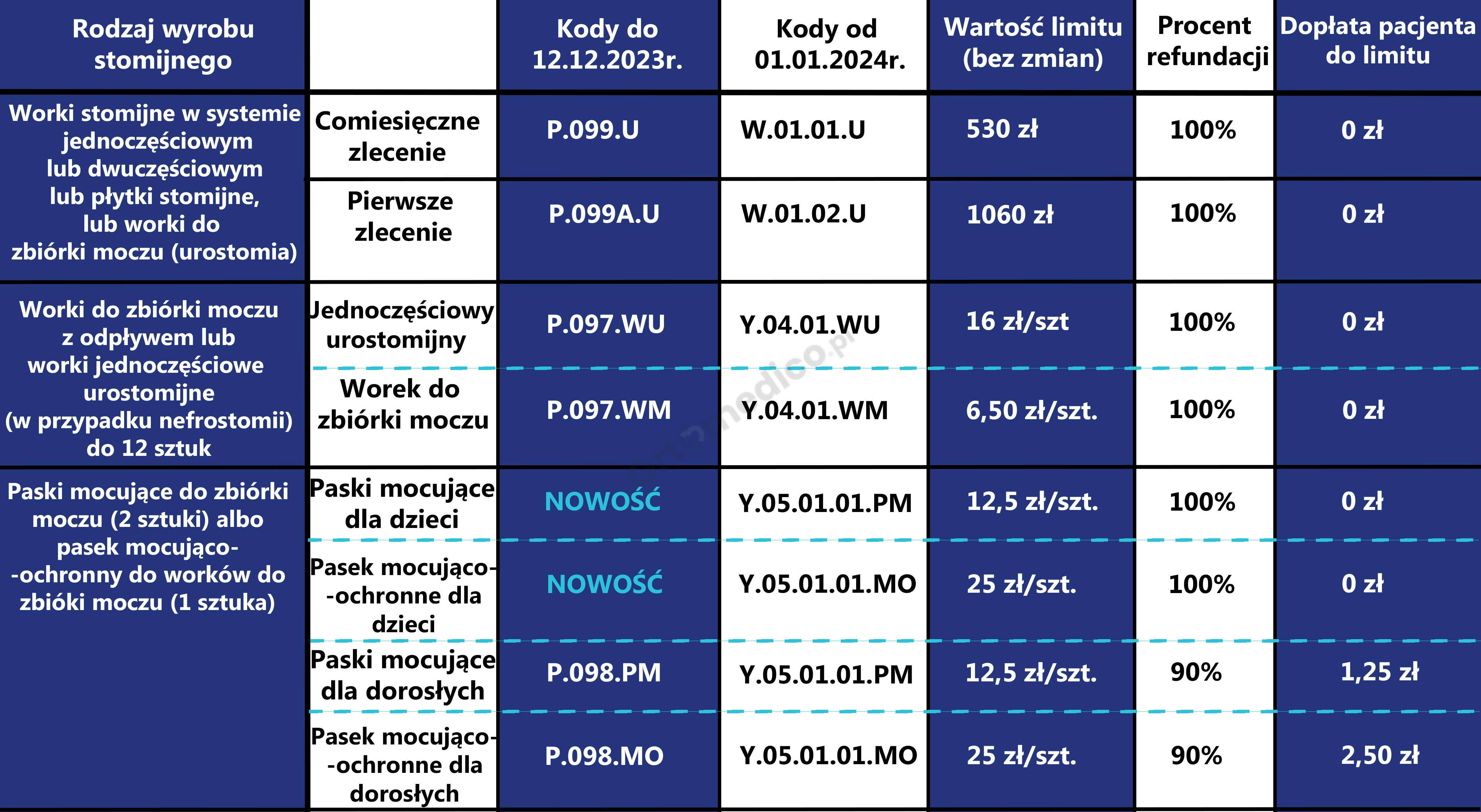 Od 1 stycznia 2023 roku zmianie uległa refundacja wyrobów stomijnych. Ustanowiono 2 zlecenia na sprzęt stomijny (P.99 worki i płytki i P.141 akcesoria) oraz osobne zlecenie (P.99.A, P.141.A) dla pacjentów nowo operowanych z podwójnym limitem. Podwyższono limity: w kolostomii i ileostomii do 450 zł ; w urostomii do 530 zł, akcesoria 120 zł w tym 20% dopłaty pacjenta. Wystawiający zlecenie będzie zlecał ryczałt lub jego część lub jego wielokrotność w przypadku pacjentów z 47ZN, 47ZND, 47DN.