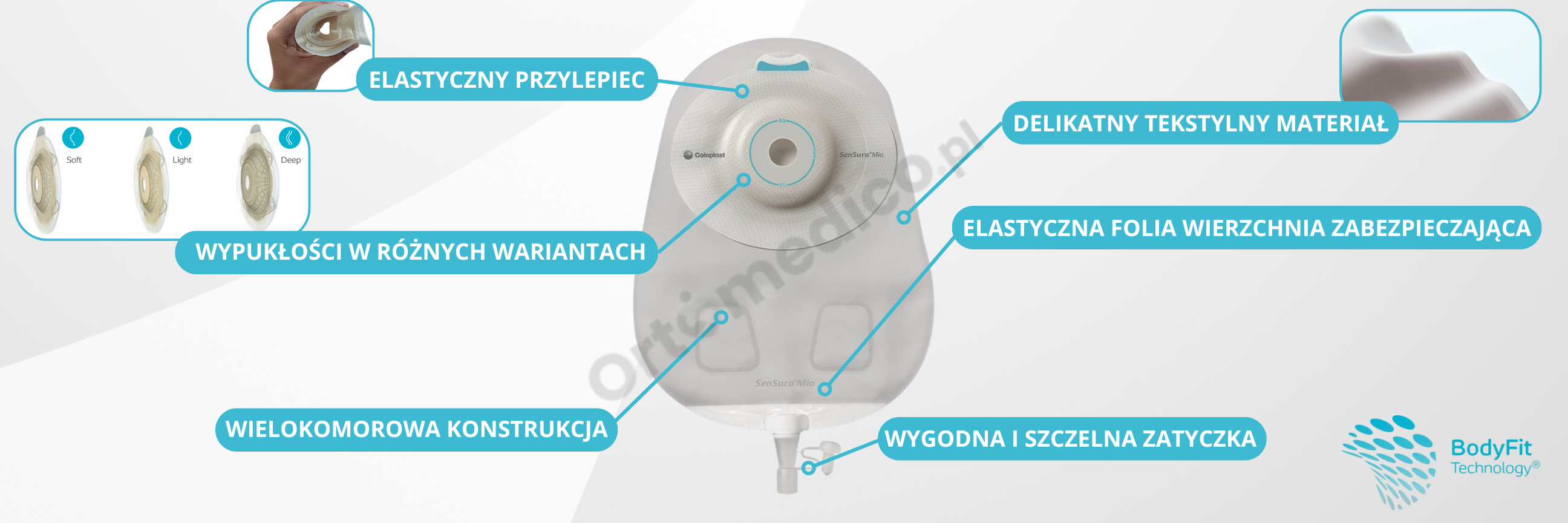 SenSura® Mio Convex Soft to zaawansowany technologicznie worek urostomijny, stworzony z myślą o osobach, które potrzebują stabilnego, ale elastycznego rozwiązania dla swojej stomii. Dzięki unikalnej budowie worek doskonale dopasowuje się do nierównych obszarów skóry, zagłębień oraz stomii wymagających podparcia, aby wydostać się ponad poziom skóry.