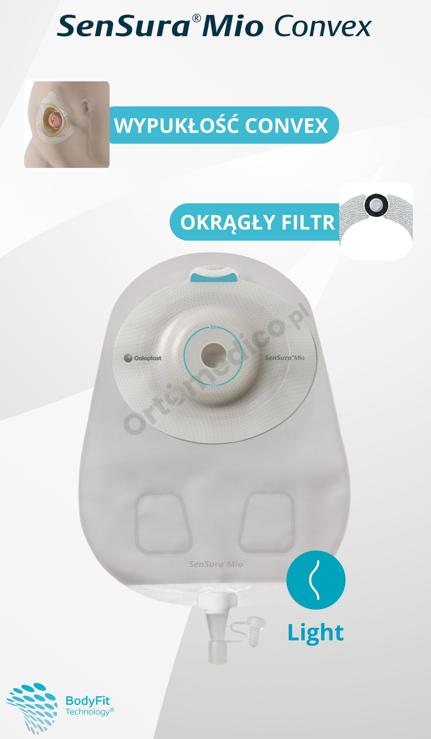 Worek urostomijny SenSura® Mio Convex Light Maxi to idealne rozwiązanie dla osób ze stomią znajdującą się na poziomie skóry lub w nieznacznych zagłębieniach. Dzięki delikatnie wypukłej płytce i elastycznemu przylepcowi zapewnia lepsze dopasowanie, stabilność i wygodę, jednocześnie zwiększając szczelność i poczucie bezpieczeństwa podczas codziennych aktywności.