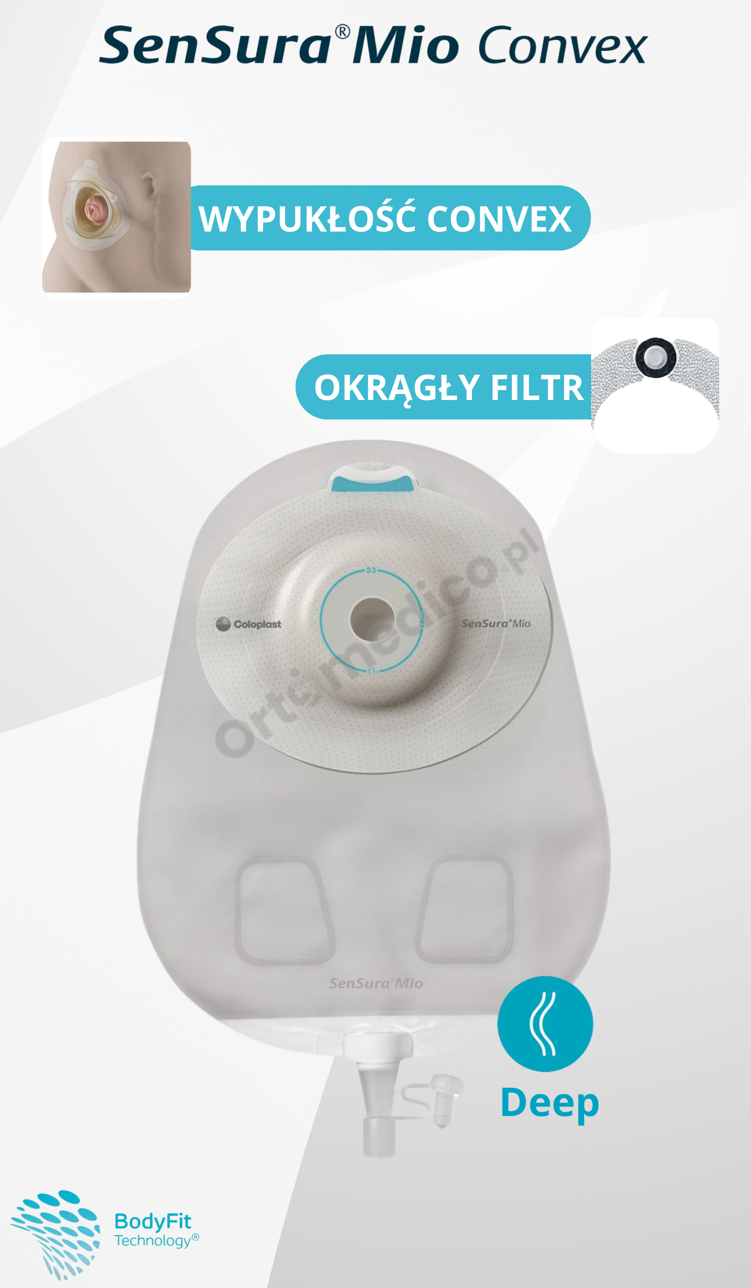 Wersja Deep Convex przeznaczona jest do stomii z otworami znajdującymi się pod powierzchnią skóry, które wymagają dużego wsparcia, aby się wysunąć, lub do głęboko położonych obszarów, gdzie do uzyskania dobrego chwytu potrzebne jest głębokie wygięcie.