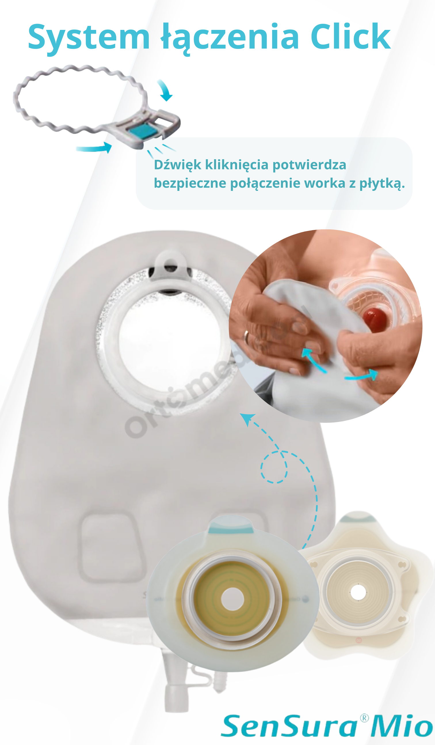 Innowacyjne zapięcie Click umożliwia szybkie i bezpieczne połączenie worka z płytką stomijną. Charakterystyczne, słyszalne „kliknięcie” daje pewność prawidłowego zamocowania, co eliminuje stres związany z ewentualnym nieszczelnym połączeniem. Dzięki temu wymiana worka jest prosta, szybka i możliwa bez konieczności wymiany płytki.