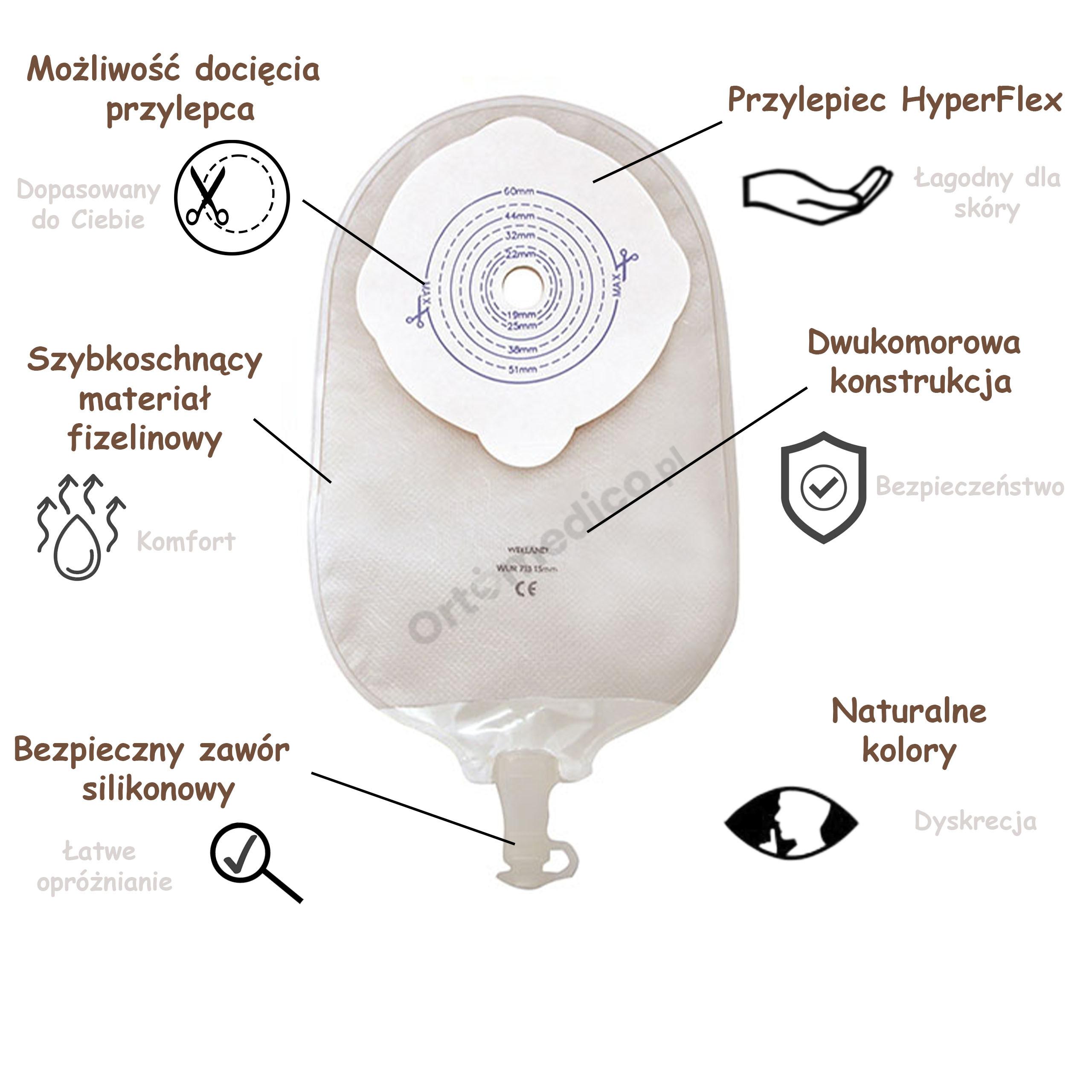 - Łagodny dla skóry: Nowoczesny przylepiec HyperFlex® zawiera aż 4 hydrokoloidy, oferując silne właściwości gojące i ochronne. Zabezpiecza skórę wokół stomii przed szkodliwym działaniem treści jelitowej, nie powodując odparzeń ani alergii.