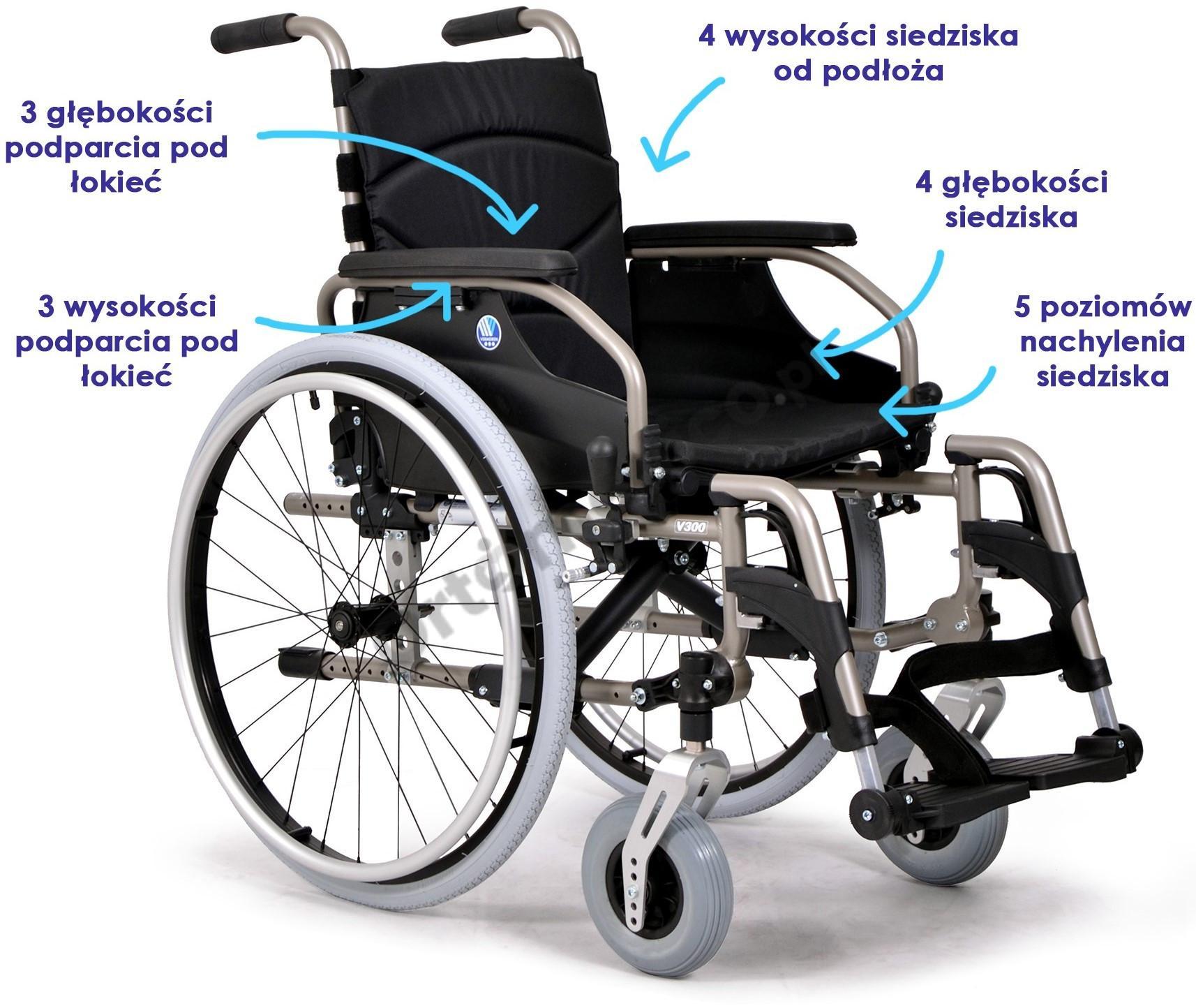 ze względu konieczności zmiany danych parametrów dla użytkownika. Model V300 został wyposażony w wiele części z możliwością regulacji parametrów między innymi: regulowana głębokość jak i wysokość siedziska, zmienna wysokość podparcia pod łokieć. Wózek ręczny V300 z pewnością dobrze dopasuje się do indywidualnych potrzeb użytkownika, dodatkowo posiada on certyfikaty, które potwierdzają wysoką jakość. Już w wyposażeniu standardowym znajdziemy poduszkę na oparcie i siedzisko oraz oparcie z regulacją napiętości pasów Velcro, odpowiedzialnych za poprawną stabilizację ciała. Dodatkowo model V300 posiada adapter koła tylnego, co zwiększa jego manewrowość.
