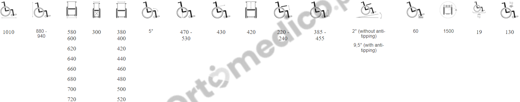 całkowita szerokość: 580,600,620,640,660,680,700,720mmszerokość wózka po złożeniu: 300mm