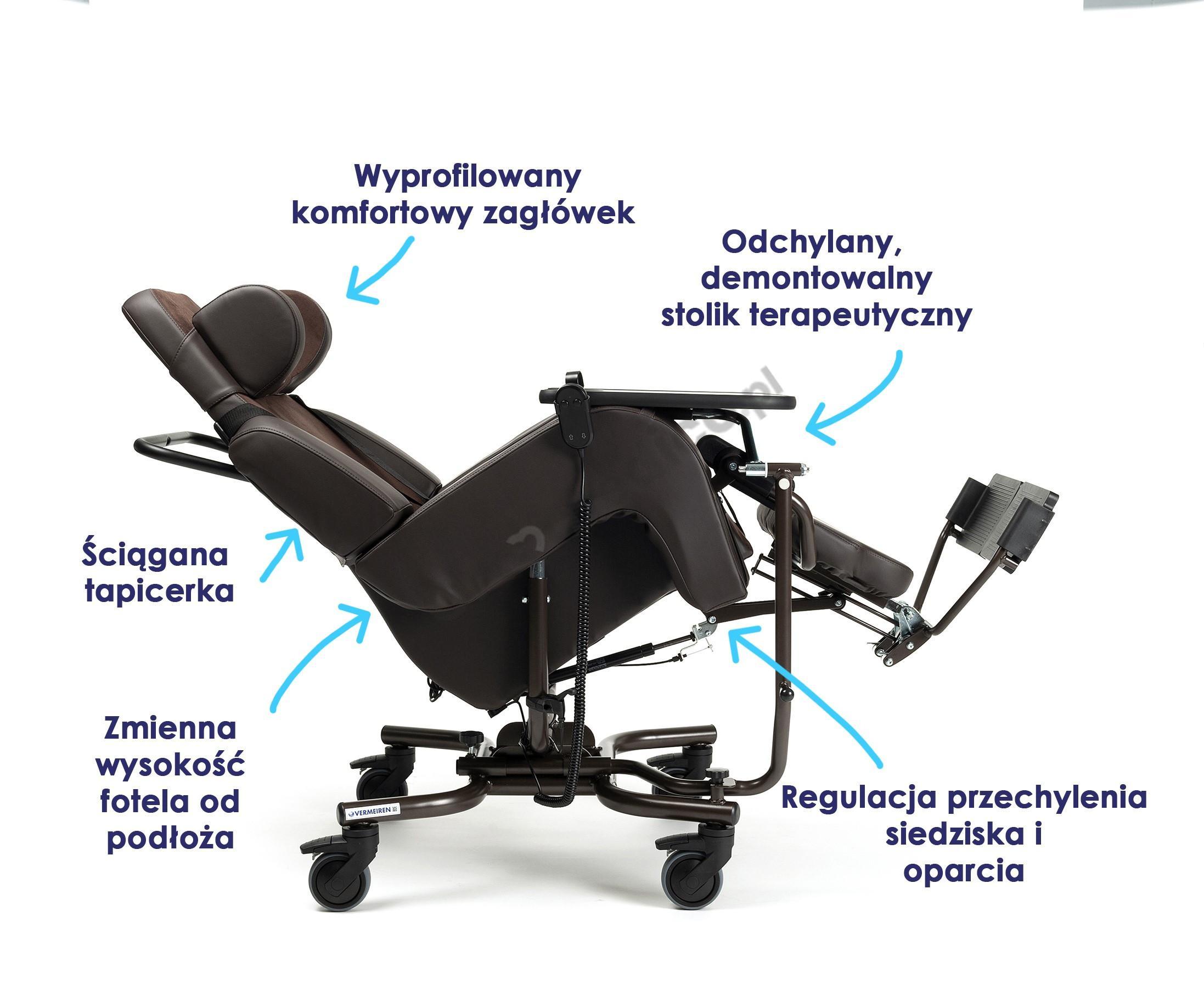 - Dla osób z schorzeniami neurologicznymi (np. po udarze, stwardnieniu rozsianym, porażeniu mózgowym), które potrzebują bezpiecznego i komfortowego fotela pielęgnacyjnego