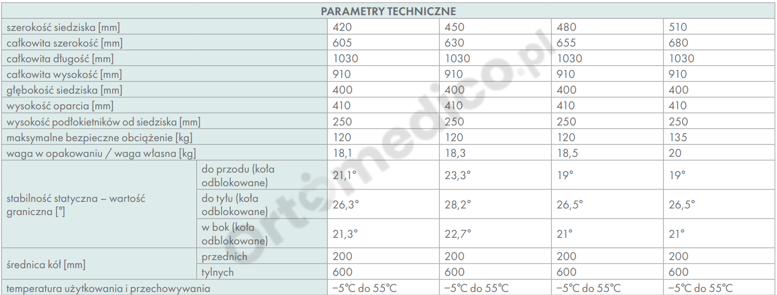 Komfort użytkownika: Nylonowa tapicerka, która jest lekka i łatwa w utrzymaniu czystości. Odchylane i demontowane podnóżki z regulacją wysokości, dostosowujące się do indywidualnych potrzeb użytkownika. Aluminiowe ciągi, które ułatwiają prowadzenie wózka.
