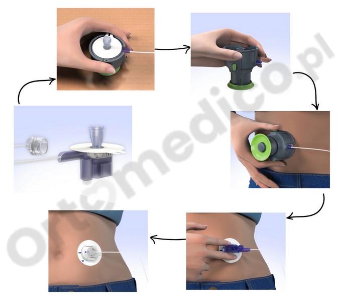 7. Podłączenie pompy - podłącz dren do pompy insulinowej i wykonaj odpowietrzenie zgodnie z instrukcją pompy